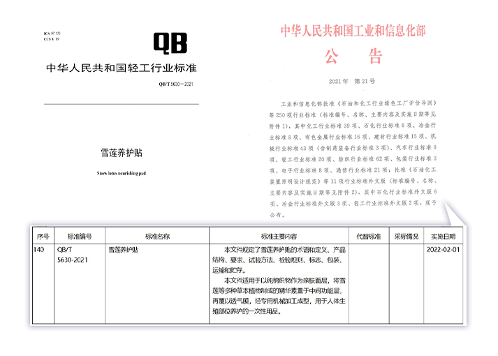 2021年10月8日,由煙臺金蕊女性用品有限公司、江蘇金天雪蓮生態(tài)保養(yǎng)有限公司、泉州市洛江區(qū)匯豐婦幼用品有限公司、中國科學(xué)院青島生物能源與過程研究所等核心企業(yè)聯(lián)合起草的《雪蓮養(yǎng)護(hù)貼》行業(yè)標(biāo)準(zhǔn)(QB/T 5630-2021)在全球范圍內(nèi)首次發(fā)布,標(biāo)志著全球生殖養(yǎng)護(hù)產(chǎn)業(yè)邁入了一個全新的發(fā)展階段。這一行業(yè)標(biāo)準(zhǔn)由中華人民共和國工業(yè)和信息化部正式批準(zhǔn),并自2022年2月1日起正式實(shí)施。